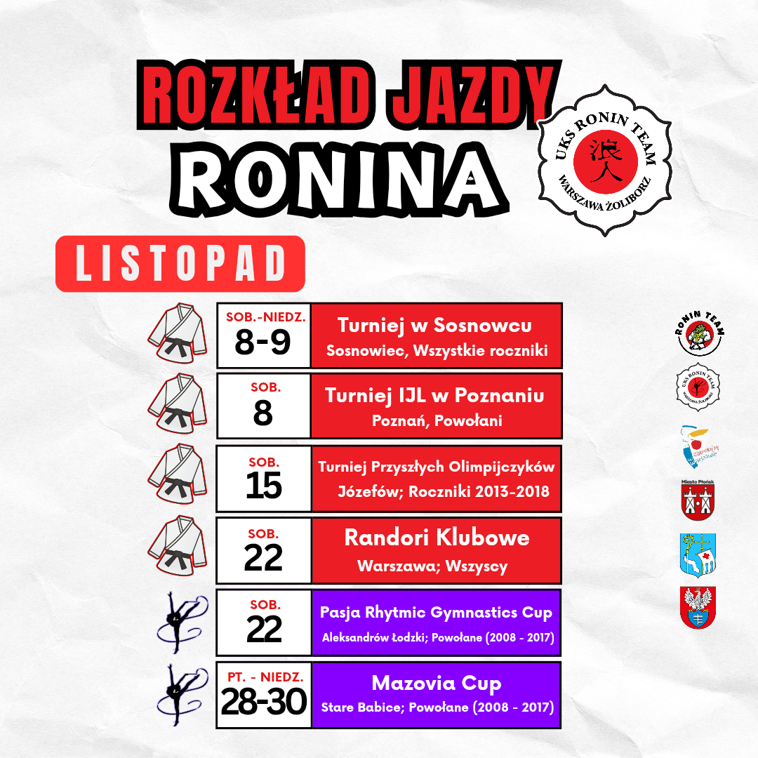 Chcesz wiedzieć, gdzie i kiedy nasi zawodnicy walczą o kolejne sukcesy? Sprawdź kalendarz startów UKS Ronin Team i bądź na bieżąco z najważniejszymi wydarzeniami!